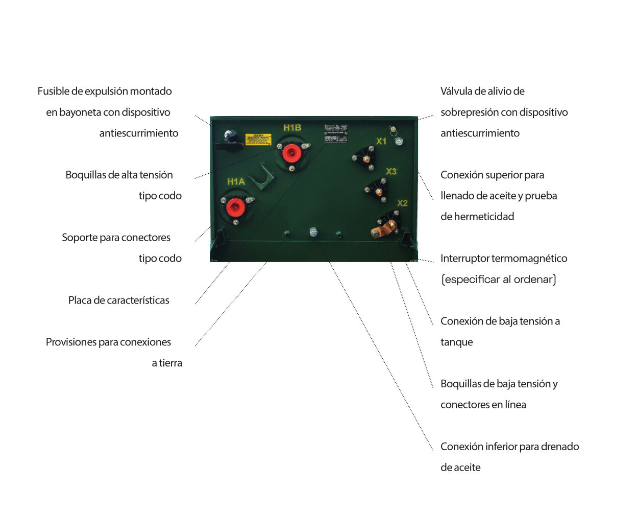 CARACTERISTICAS:65 ̊C DE ELEVACIÓN DE TEMPERATURA (55 ̊C DISPONIBLE BAJO SOLICITUD) CON O SIN INTERRUPTOR TERMOMAGNÉTICO CAMBIADOR DE DERIVACIONES DE OPERACIÓN EXTERIOR (ESPECIFICAR AL ORDENAR) FRENTE MUERTO BOQUILLAS DE MEDIA TENSIÓN TIPO POZO BOQUILLAS DE BAJA TENSIÓN CON CONECTORES EN LÍNEA FUSIBLE DE EXPULSIÓN EN SERIE CON FUSIBLE LIMITADOR DE CORRIENTE INDICADOR DE FALLA (ESPECIFICAR AL ORDENAR) GABINETE CERRADO TAPA DEL TANQUE SOLDADA MANTENIMIENTO MÍNIMO POR CONTAMINACIÓN TANQUE DE ACERO AL CARBÓN O ACERO INOXIDABLE